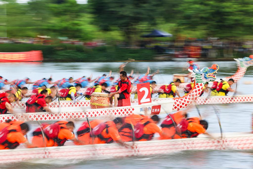 6月20日,在广西玉林园博园,选手进行龙舟竞赛。
