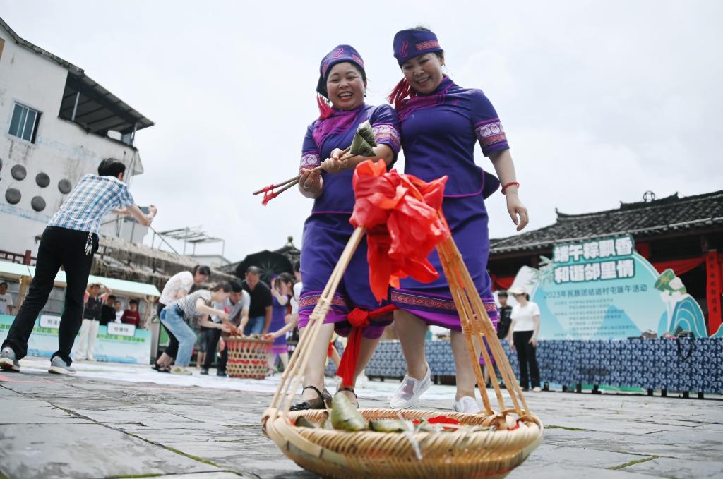 6月20日,在广西罗城仫佬族自治县东门镇石围古村,群众代表参加抢粽子比赛。