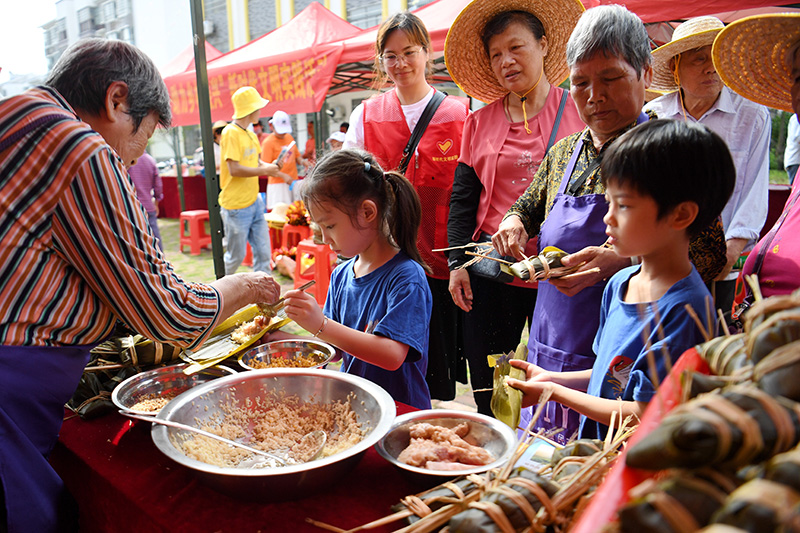 随后,志愿者和社区居民围在一起捋粽叶、填糯米、放豆子、埋肉馅、裹叶子、扎线……大家有说有笑,其乐融融,一边包粽子一边唠家常,现场一片欢声笑语。