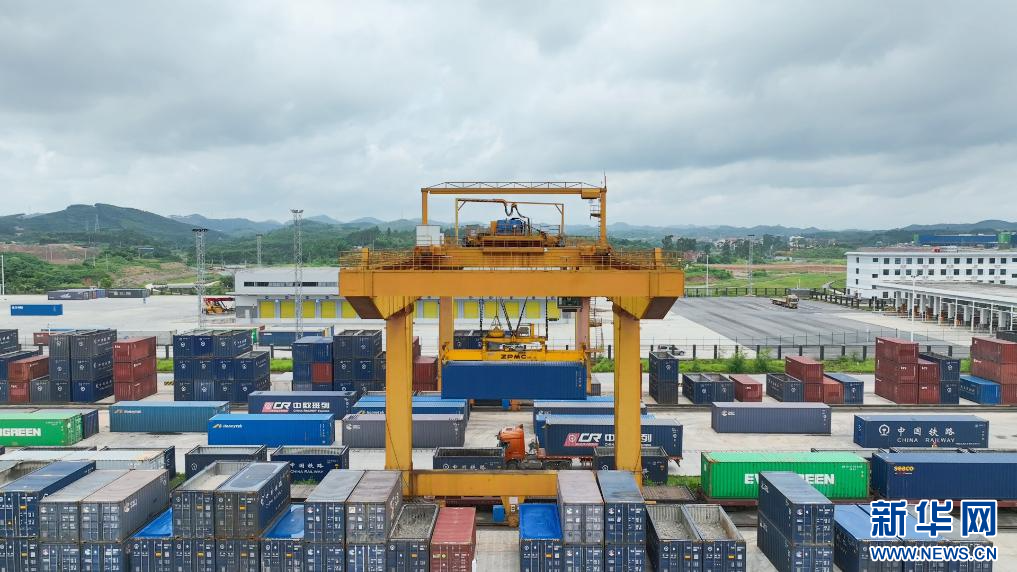 7月20日,在南宁国际铁路港,门吊作业人员将跨境集装箱有序吊装到火车上(无人机照片)。