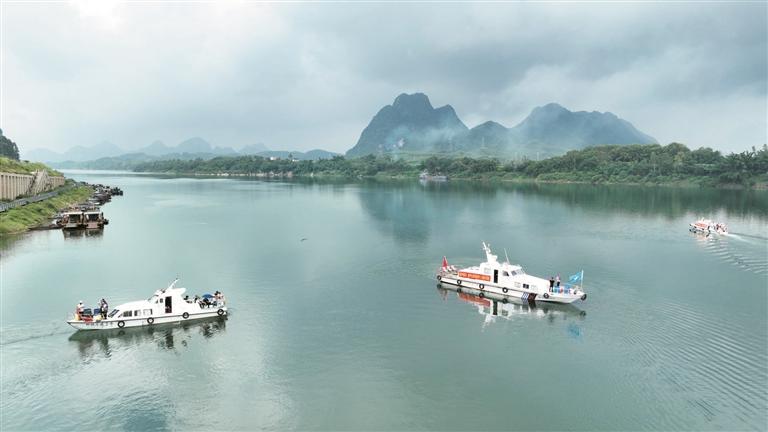 图一:7月21日,在柳城县凤山镇融江水域,柳城县各级人大代表在江面上参与巡江活动。