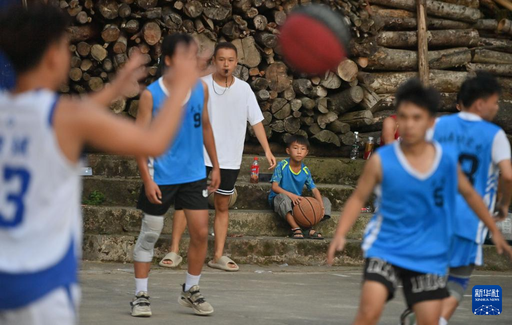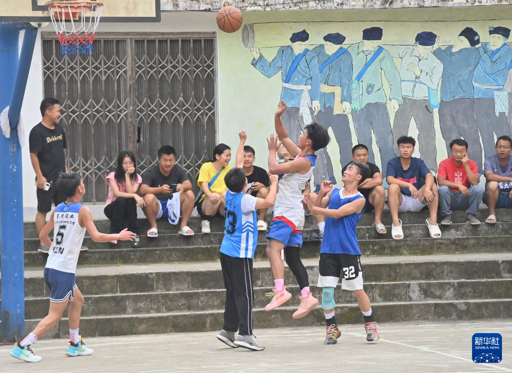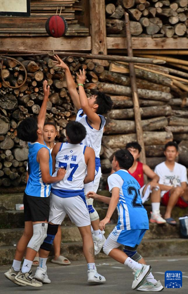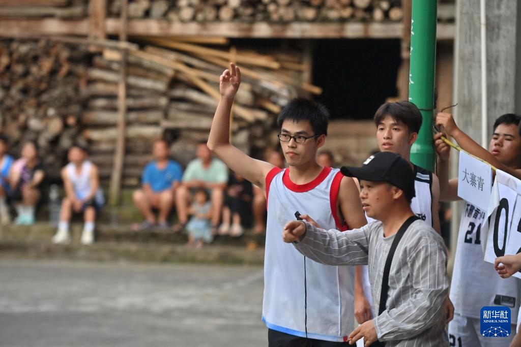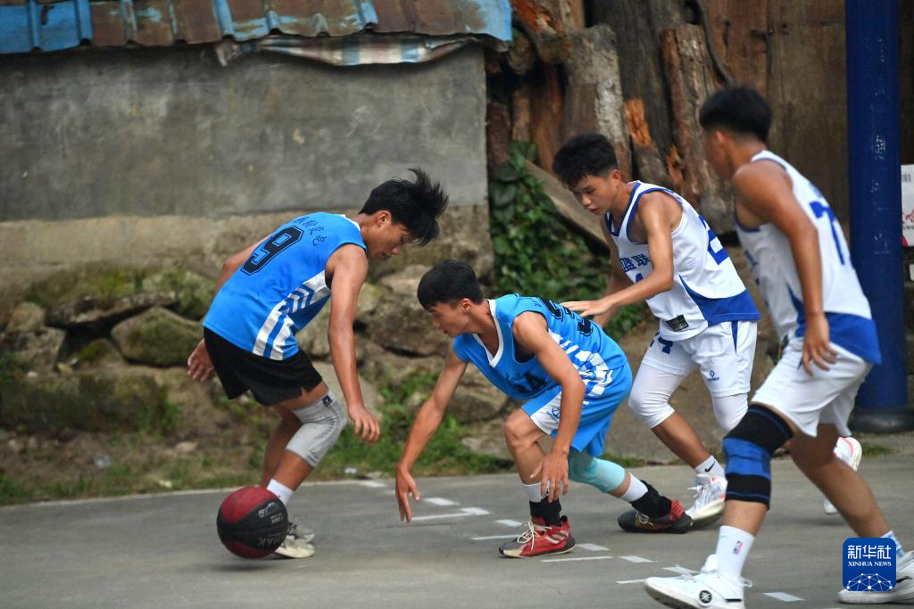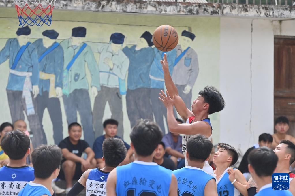 在融水苗族自治县杆洞乡尧告村田边屯篮球场,村民们在进行篮球比赛(8月1日摄)。