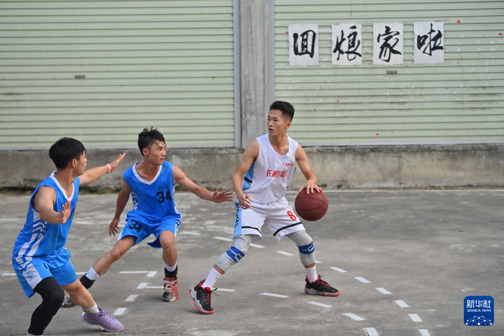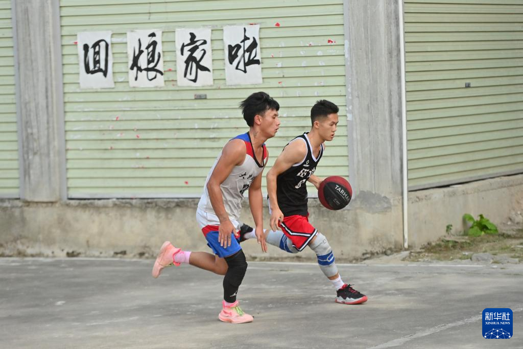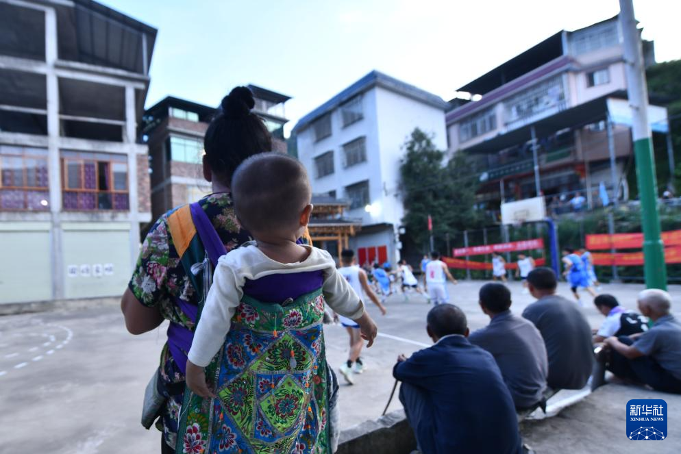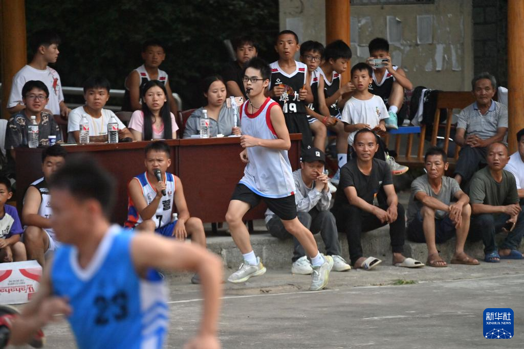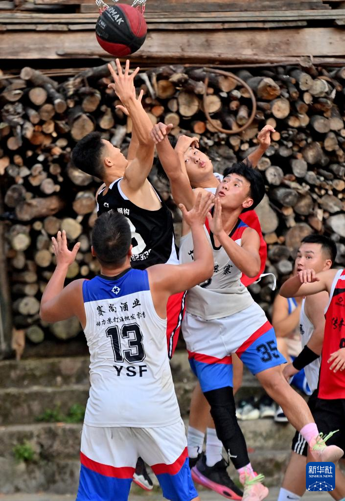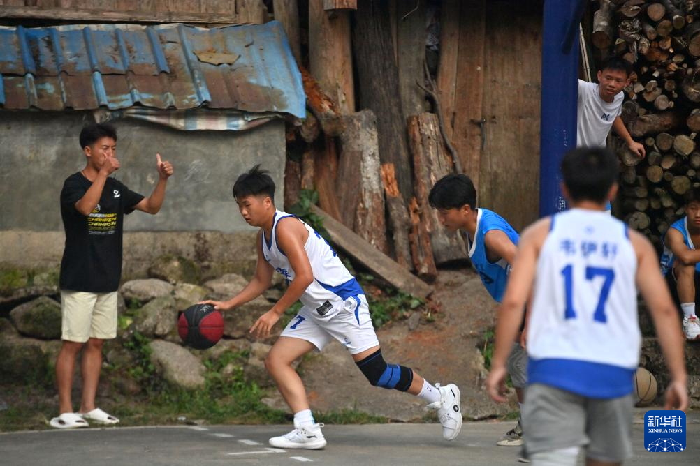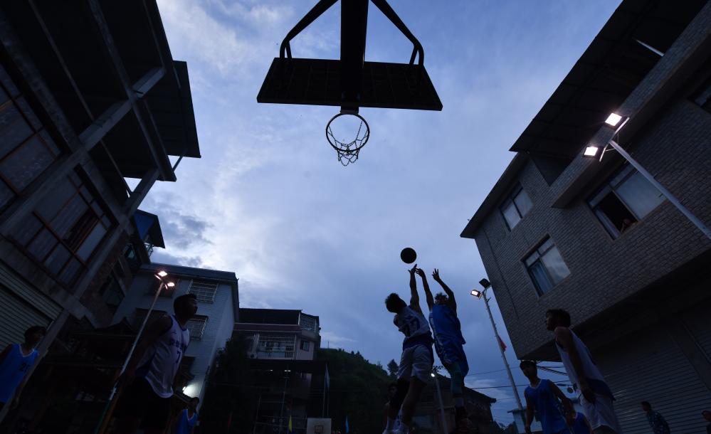 在融水苗族自治县杆洞乡尧告村田边屯篮球场,村民们在进行篮球比赛(8月1日摄)。
