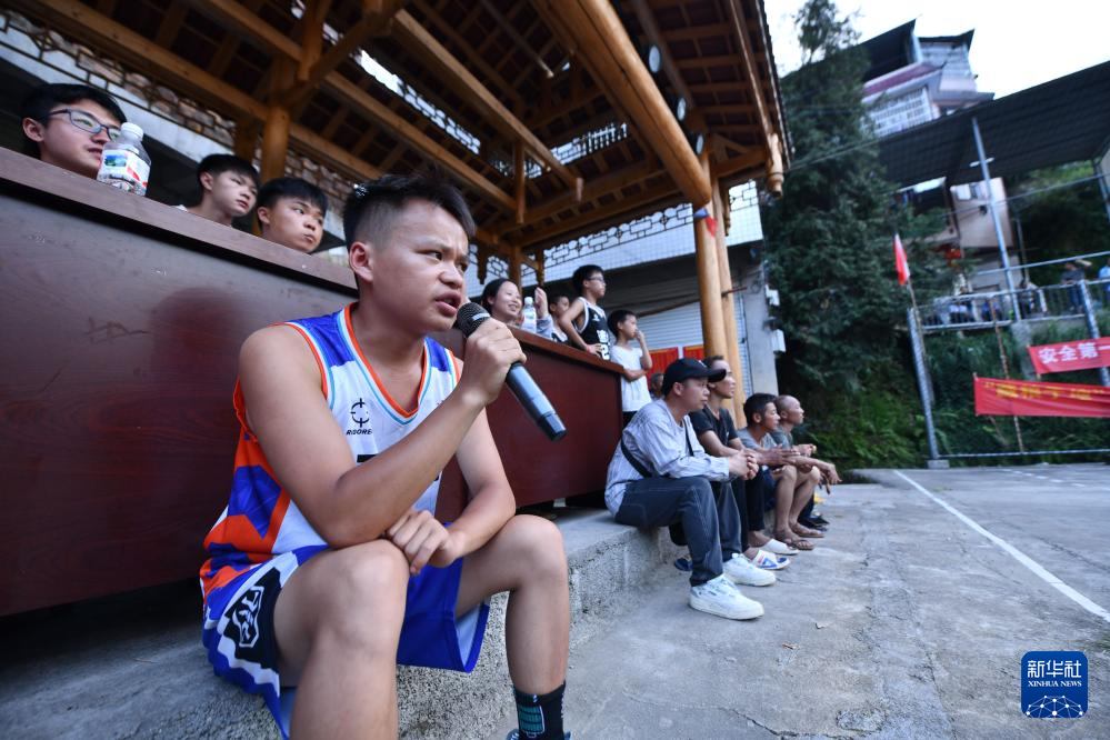 在融水苗族自治县杆洞乡尧告村田边屯篮球场,大学生韦仕绅(前)解说篮球比赛(7月31日摄)。