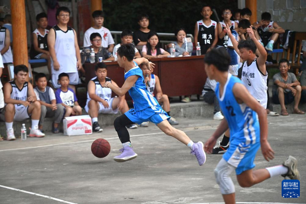 在融水苗族自治县杆洞乡尧告村田边屯篮球场,田边青年队球员韦俊杰(右一)在比赛中带球(7月31日摄)。
