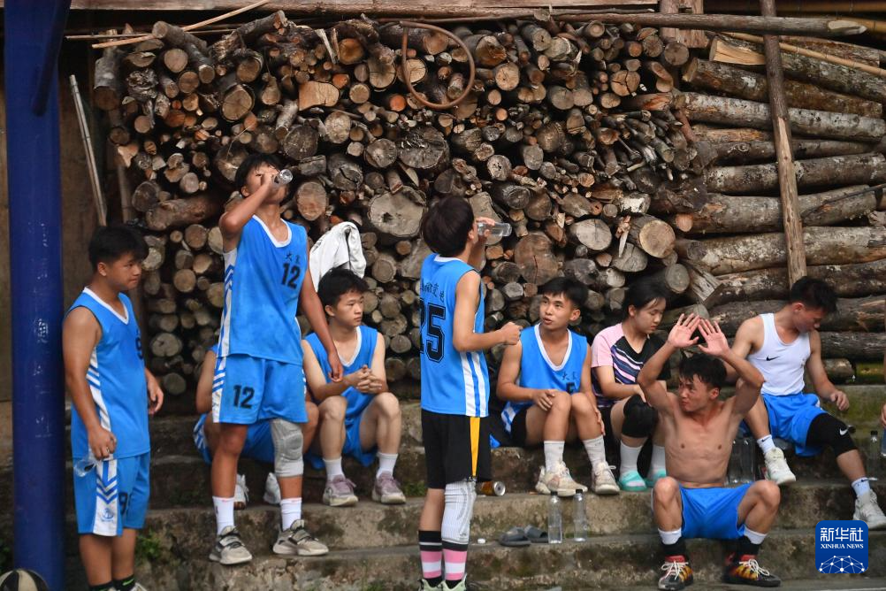 在融水苗族自治县杆洞乡尧告村田边屯篮球场,大寨青年队球员在场边休息(7月31日摄)。