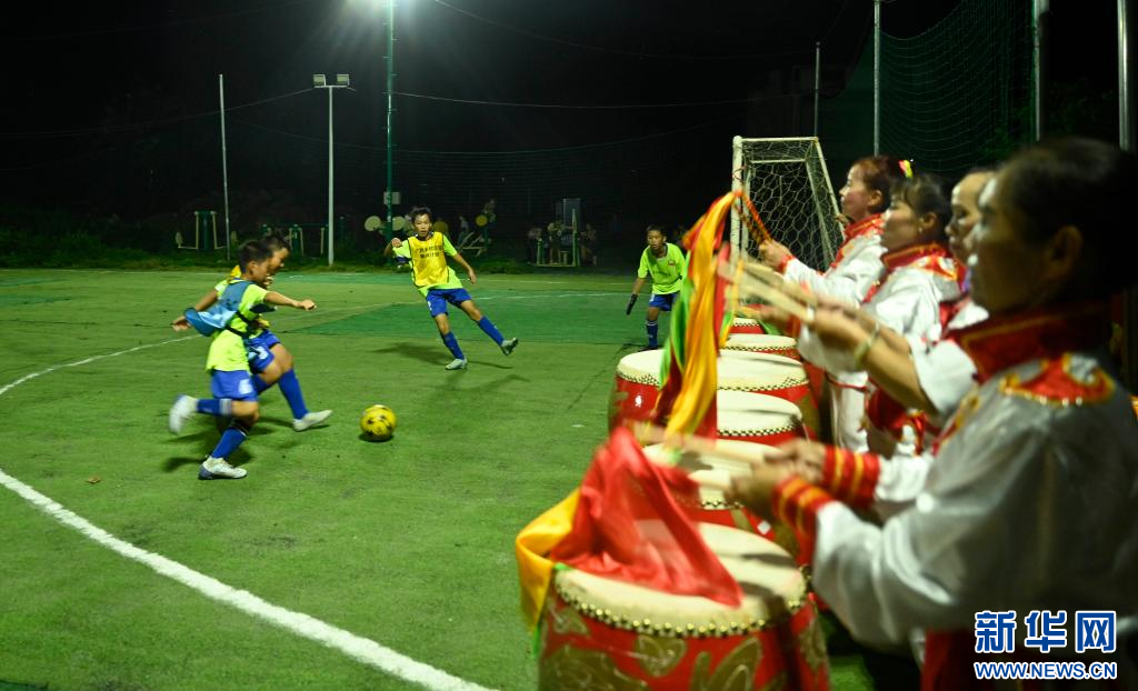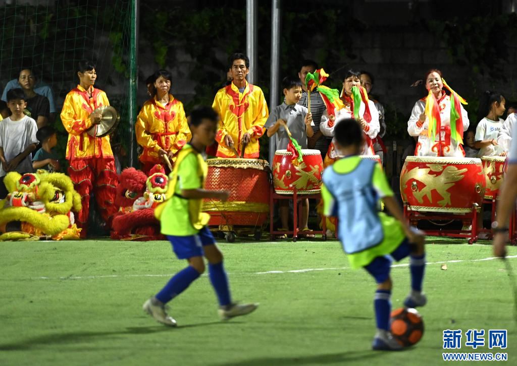 8月7日晚,村民敲锣打鼓为参加足球赛的孩子们加油助威。