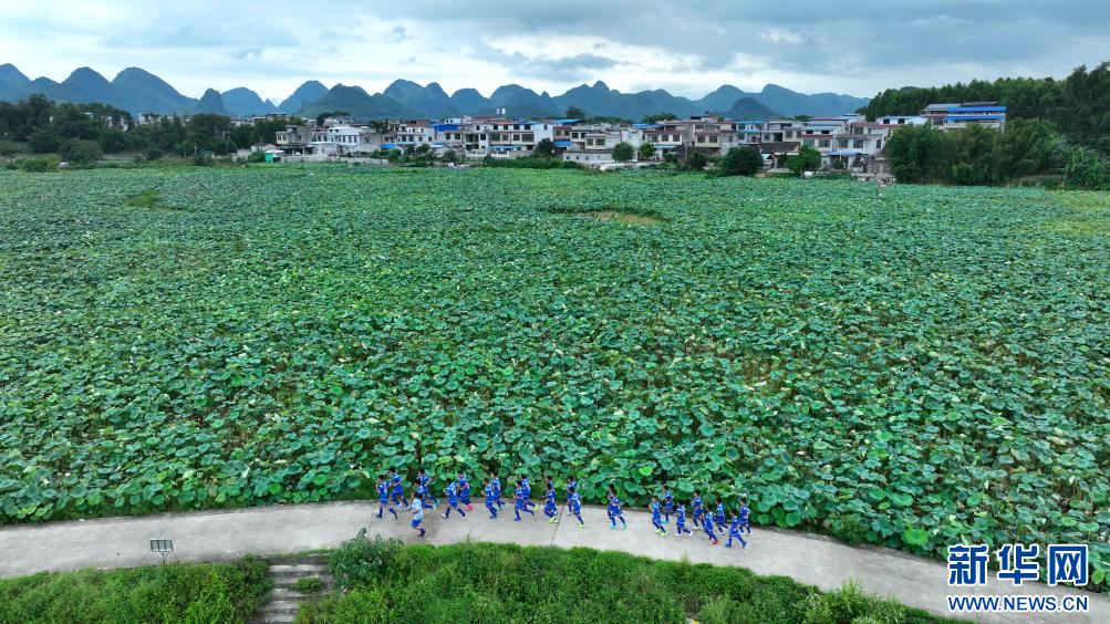 8月7日傍晚,孩子们在荷塘边跑步锻炼体能(无人机照片)。