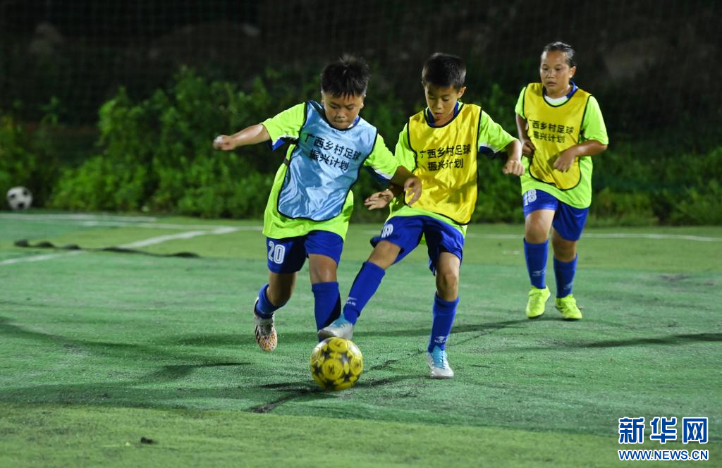 8月7日晚,孩子们在绿茵场上进行足球比赛。
