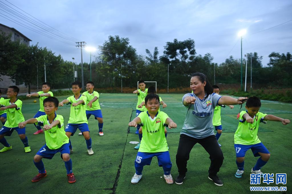 8月7日晚,孩子们在足球场上进行训练(无人机照片)。