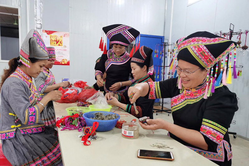 近日,来自百色市右江区大楞乡60名妇女在广西“金绣球”居家灵活就业示范基地——百色非遗体验馆(麽乜)完成麽乜技能培训后,加入居家就业队伍行列,开始接单自主完成麽乜制作。