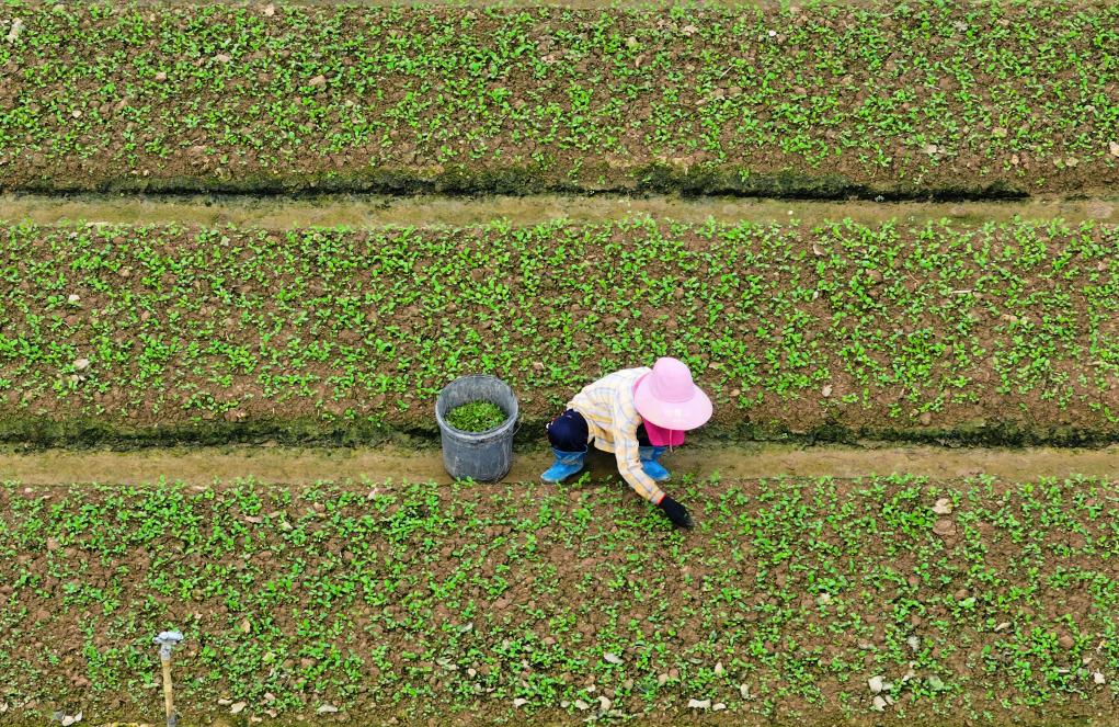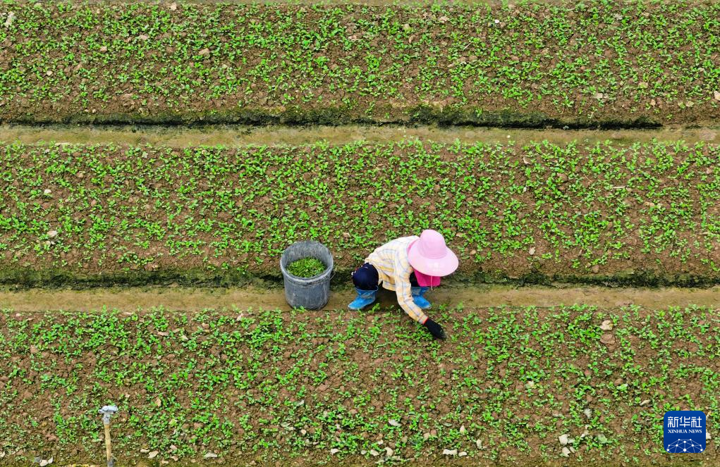 8月23日,在广西南宁市西乡塘区石埠街道下灵村蔬菜基地,农民护理蔬菜幼苗(无人机照片)。