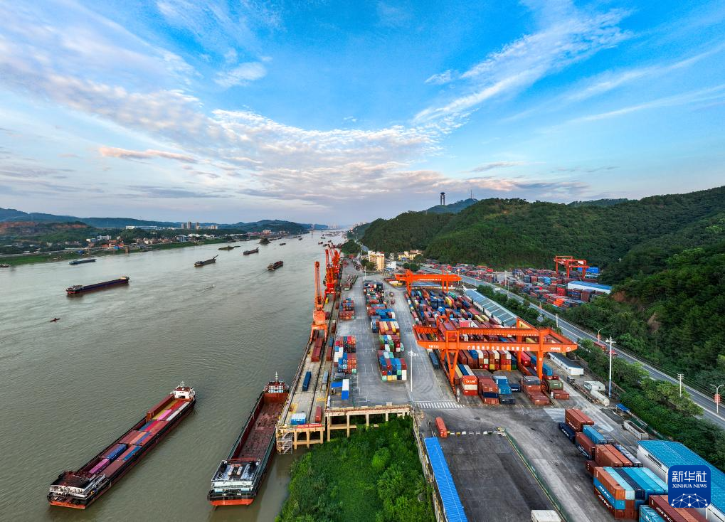 9月4日,广西梧州市中外运仓码有限公司集装箱码头上的起重设备在紧张有序进行装卸作业,西江船只往来穿梭(无人机照片)。