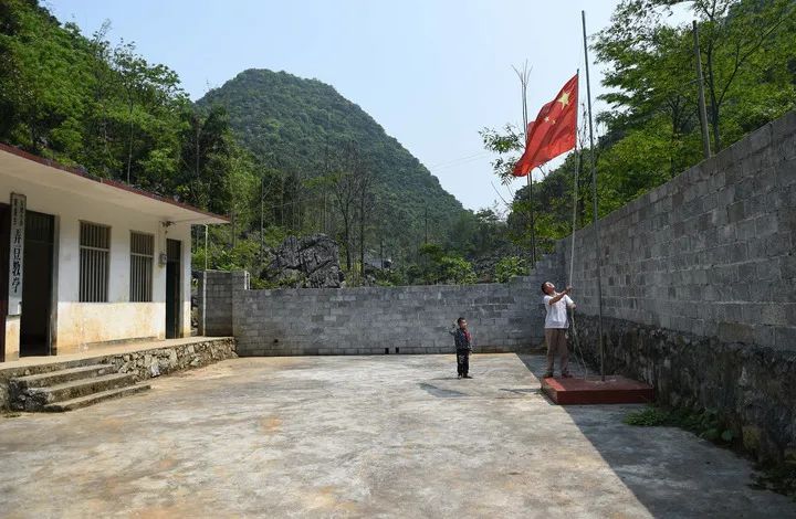 这是2015年4月15日我在广西都安瑶族自治县菁盛乡义德小学弄豆教学点拍摄的一张一师一生升国旗的照片。当时,这所学校只有蓝启飞老师和学生蓝孟源两个人。每天,蓝启飞老师按时为唯一的学生蓝孟源上课,寂静大山,书声频起。