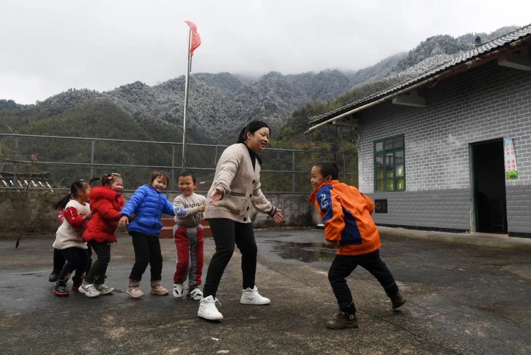 在广西灵川县兰田瑶族乡东良教学点,石夏月和学生课间玩“老鹰捉小鸡”游戏(2022年2月24日摄)。新华社记者陆波岸 摄