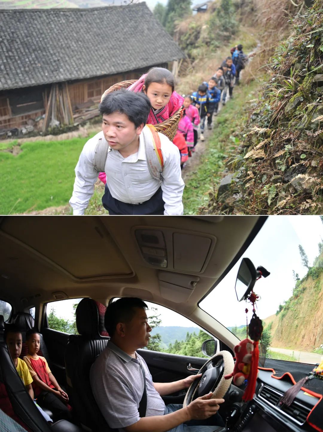 这是一张拼版照片。上图:在广西龙胜龙脊镇江柳村,江柳村翁江小学唯一的老师在放学路上将一个走不动了的孩子背在背篓里,领着其他孩子一起回家(2013年2月26日摄);下图:在广西龙胜龙脊镇江柳村,江柳村翁江小学唯一的老师余启贵开着自己的汽车带着学生去学校(2020年7月7日摄)。新华社记者陆波岸 摄
