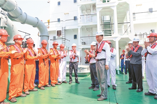 2010年正式投产的“天鲸号”是亚洲第一、世界第三强的自航绞吸式挖泥船,具备“挖得快”“吹得远”“能自航”等多项硬实力,于今年8月底投入平陆运河建设。在平陆运河航道海上疏浚施工点,“天鲸号”正有序开展航道疏浚作业。刘宁登上“天鲸号”,实地考察了解“天鲸号”投入平陆运河建设有关情况,看望慰问一线工人代表。“‘天鲸号’功勋卓著,为国家科技事业发展和重大工程建设作出了重要贡献。大家作为‘天鲸号’的一员,舍小家、顾大家,坚守在工程建设一线,为广西经济社会发展特别是平陆运河建设作出了积极贡献。大家辛苦了!”刘宁对大家的辛勤付出表示衷心感谢和亲切问候,勉励大家深入贯彻落实习近平总书记重要指示批示精神,继续发扬“天鲸号”的“宁可让汗水漂起船,也不让工期拖一天”精神,鼓足干劲、力争上游,共同努力把这条通江达海的平陆运河建设好,全力打造优质工程、绿色工程、廉洁工程。
