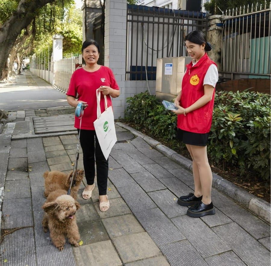 柳州市税务局“滴水蓝”节水宣传志愿者向过往群众搜集节水小妙招并赠送节约用水手提袋(梁济麟 摄)
