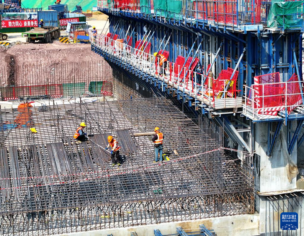 工人在平陆运河青年枢纽施工现场架设钢筋(10月3日摄,无人机照片)。