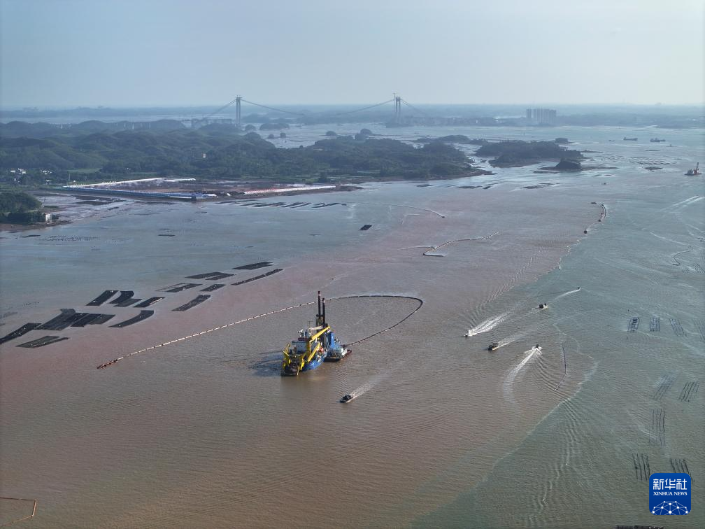 我国重型自航绞吸挖泥船“天鲸号”在平陆运河入海口段进行疏浚作业(10月3日摄,无人机照片)。