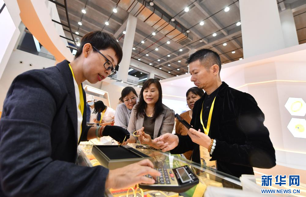 10月18日,观众在珠宝展上选购商品。