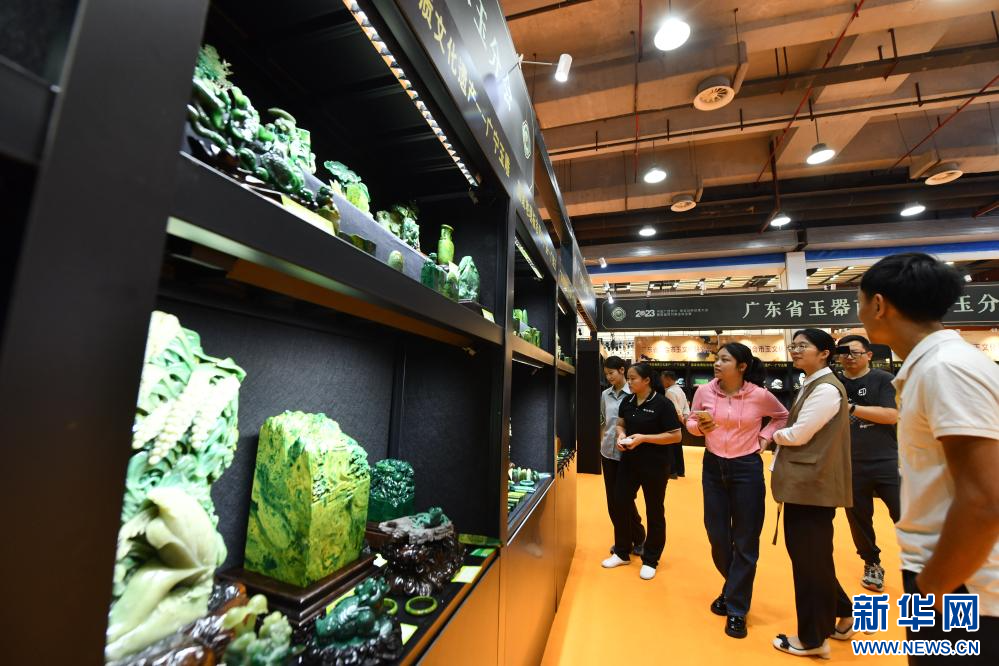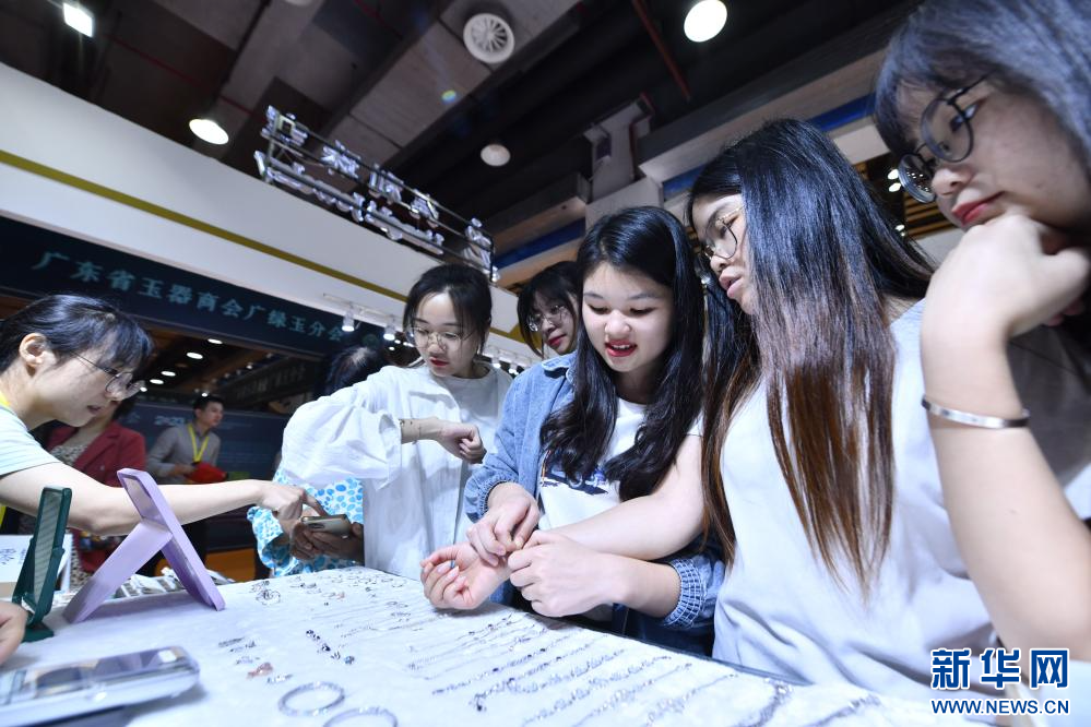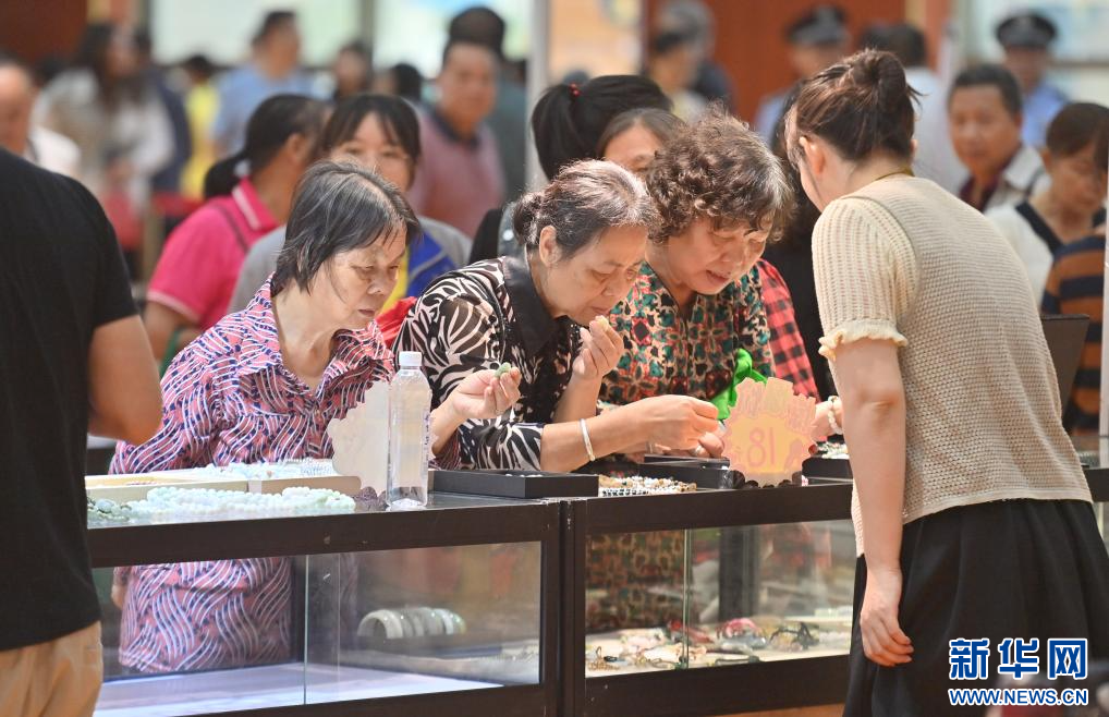 10月18日,观众在珠宝展上选购、鉴赏玉石。