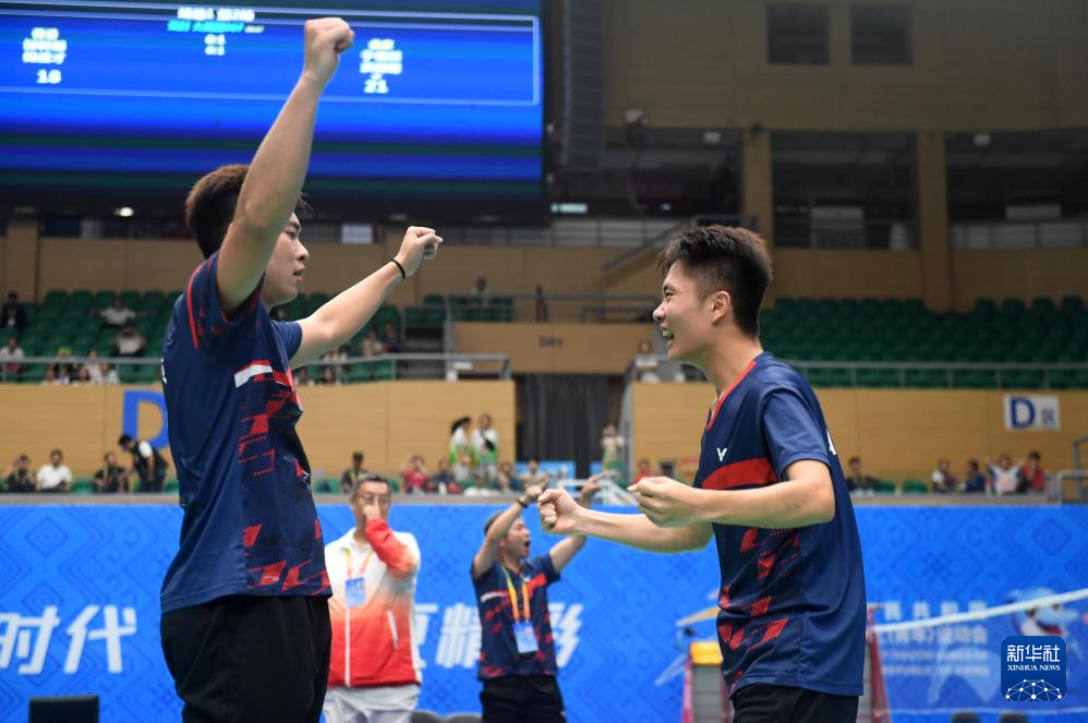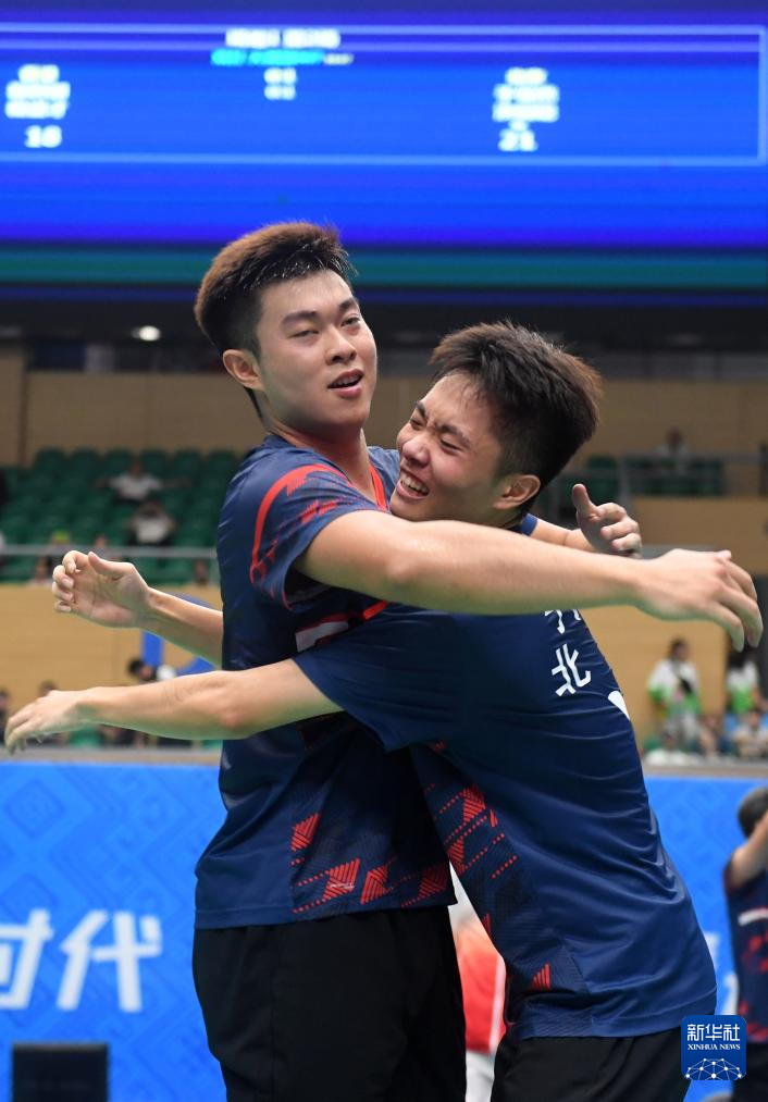 10月24日,北京队组合洪毅聪(左)/于傲然在双打比赛后庆祝胜利。他们以2比0战胜香港队组合邹轩朗/杨盛才。最终,北京队以2比0的总比分战胜香港队,获得冠军。