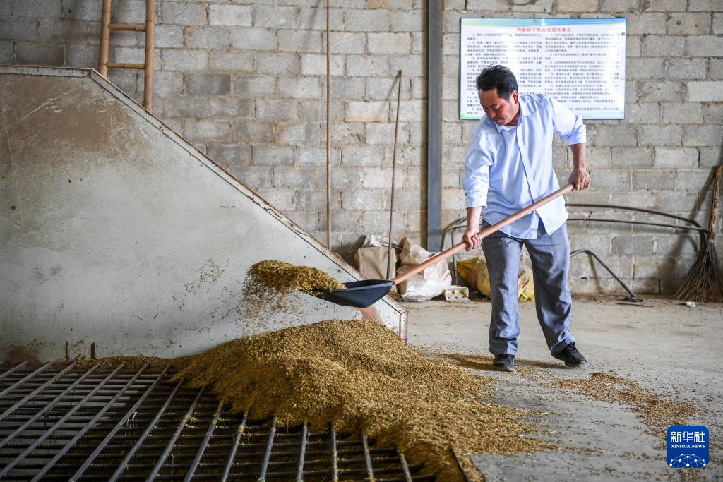 10月24日,在广西贵港市港北区大圩镇,村民将稻谷投入烘干机。