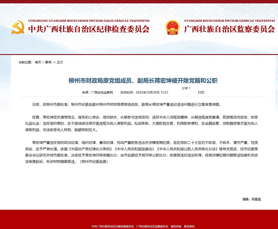 【原标题】柳州市财政局原党组成员、副局长蒋宏坤被开除党籍和公职