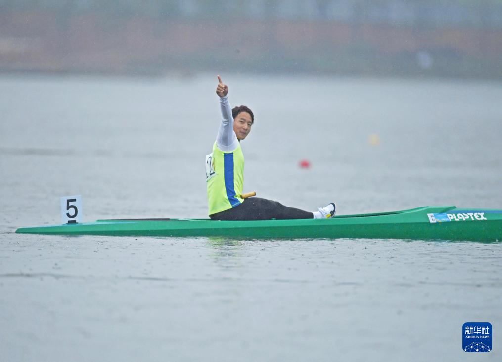 10月29日,遵义市选手冯玉玲在女子单人划艇200米决赛中冲过终点后庆祝。最终,冯玉玲以47秒564的成绩夺得该项目冠军。