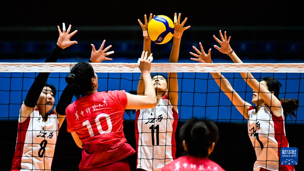10月31日,湖北队球员拦网防守江西队球员徐钰晗(右二)扣球。最终湖北队以3比1战胜江西队。