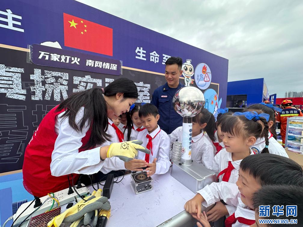 消防员和志愿者在给小朋友进行消防科普宣传。(牙举成 摄)