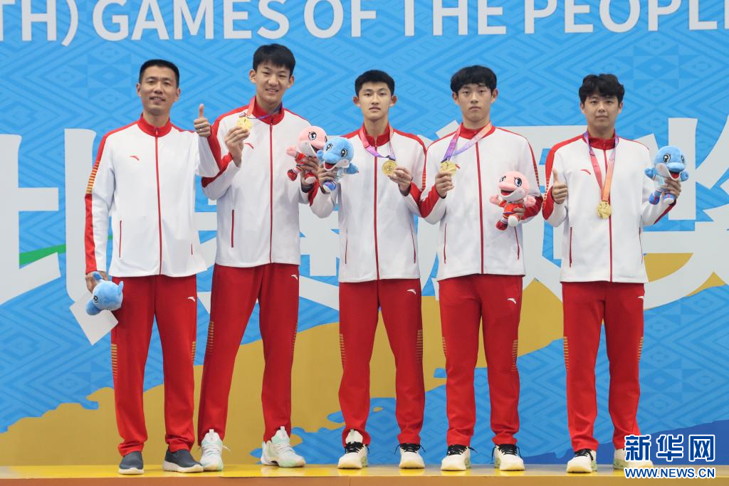 11月7日,南京队蒋一宁/路士颢/孙润泽/王宇琨和教练在领奖台上。