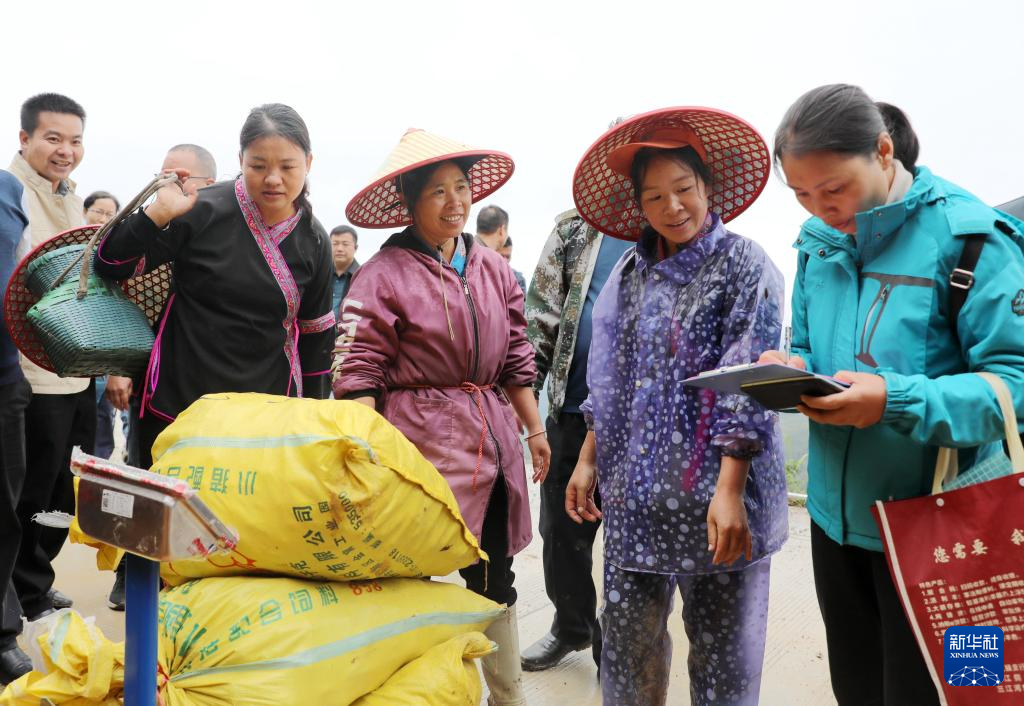 11月11日,在三江县丹洲镇龙万山油茶基地,人们在给油茶果称重。