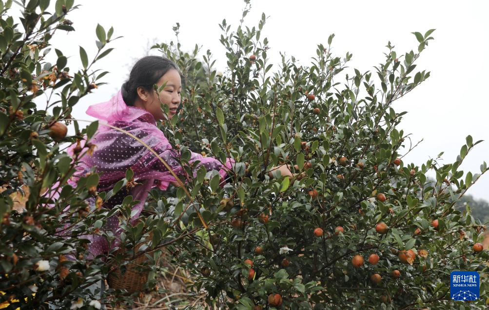 11月11日,在三江县丹洲镇龙万山油茶基地,参赛选手在采摘油茶果。