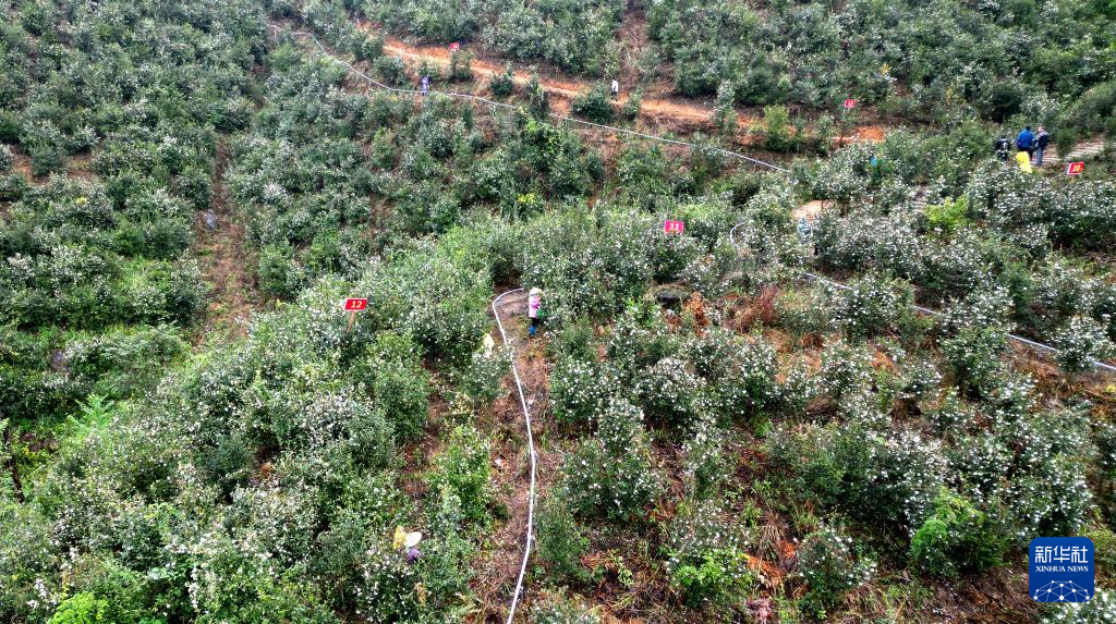 11月11日,在三江县丹洲镇龙万山油茶基地,选手比赛采摘油茶果(无人机照片)。
