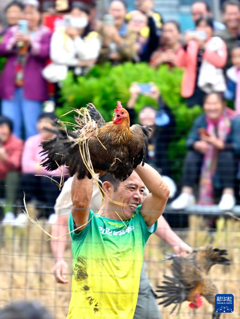 11月11日,在广西柳州市柳城县古砦仫佬族乡的稻田里,人们参加抓鸡比赛。