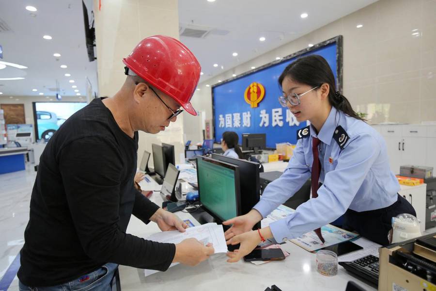图为融水县税务局办税服务厅工作人员吴莎莎在11月征期受理缴费人线下办税时,热情辅导缴费人填写申请材料。(梁新宗摄)