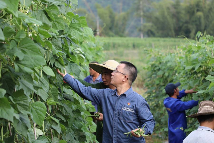 图为都阳镇加城村驻村第一书记和村民采摘四季豆。 陆荣斌 摄