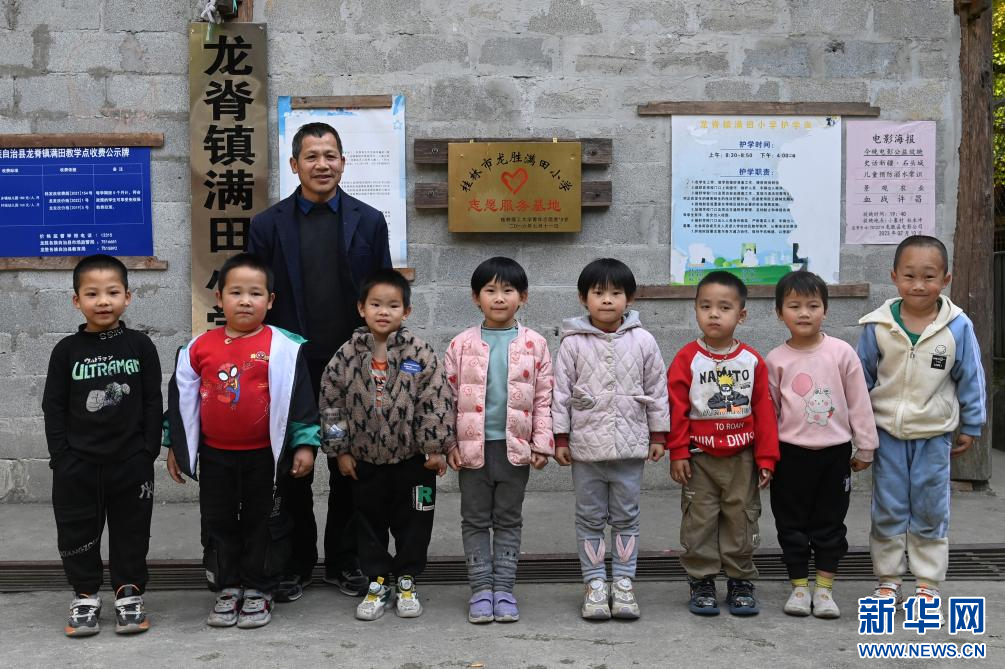11月29日,广西龙胜各族自治县龙脊镇满田小学的潘从汉老师和学生合影。