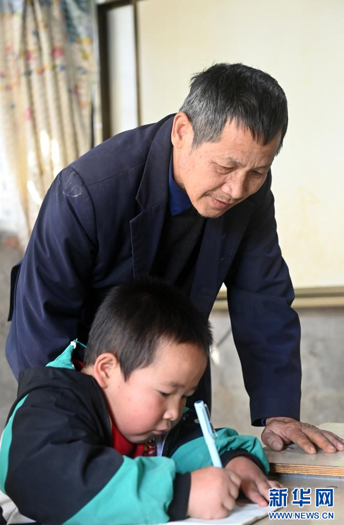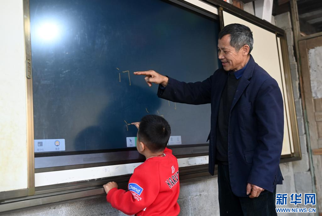 11月29日,广西龙胜各族自治县龙脊镇满田小学的潘从汉老师在课堂上辅导一名学生功课。
