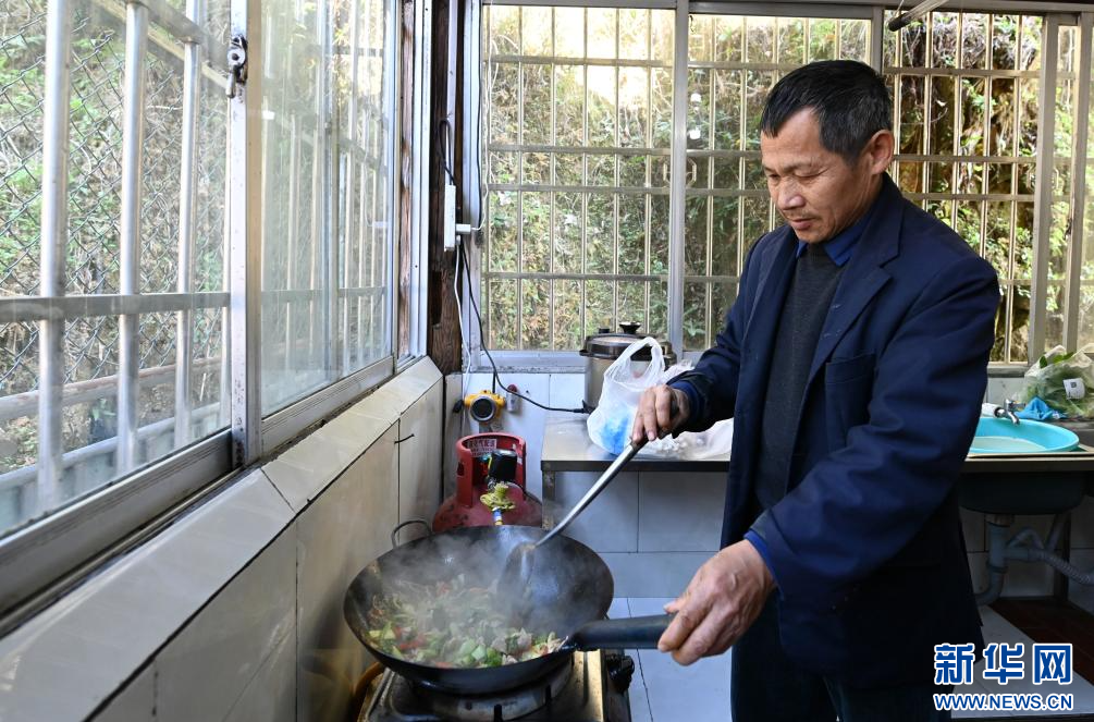 11月29日,广西龙胜各族自治县龙脊镇满田小学的潘从汉老师在课间炒菜给学生做午饭。