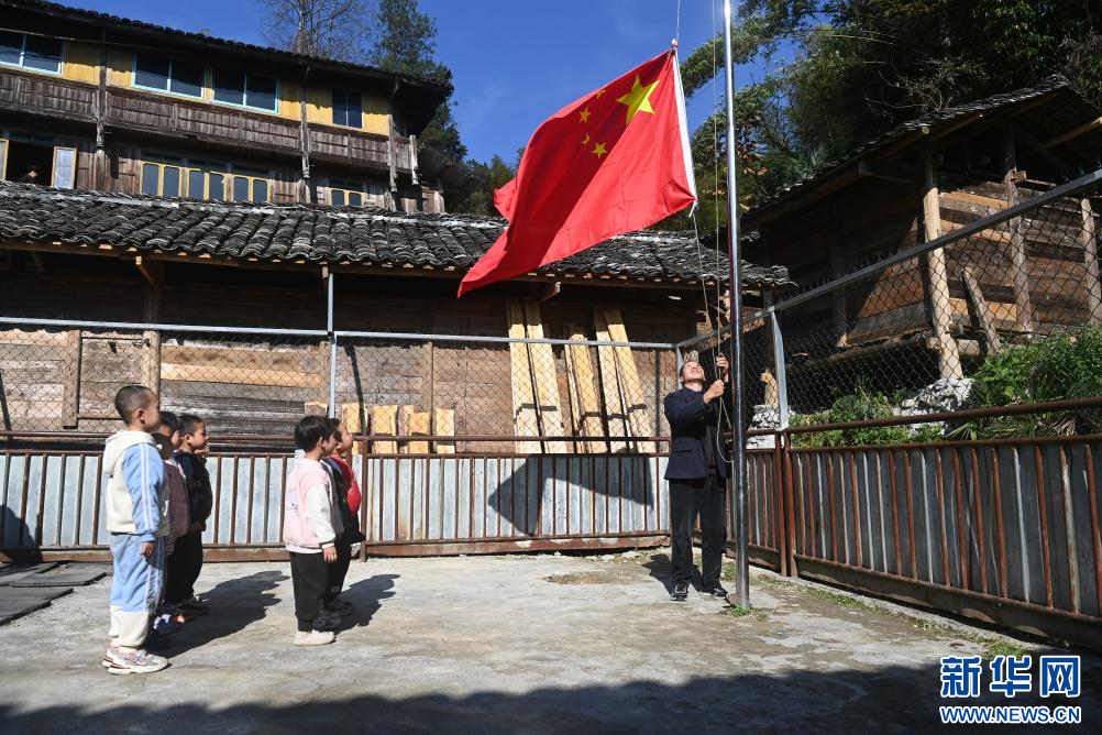 11月29日,广西龙胜各族自治县龙脊镇满田小学的潘从汉老师和学生升国旗。