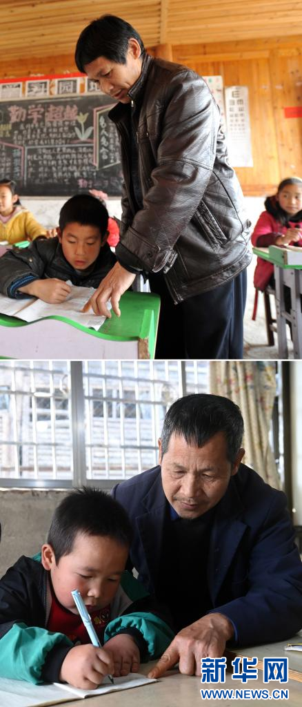 拼版照片:上图为时任广西龙胜各族自治县龙脊镇小寨小学教师的潘从汉老师在课堂上辅导学生功课(2014年3月13日摄);