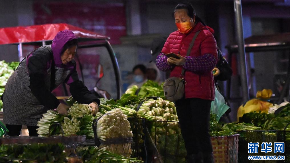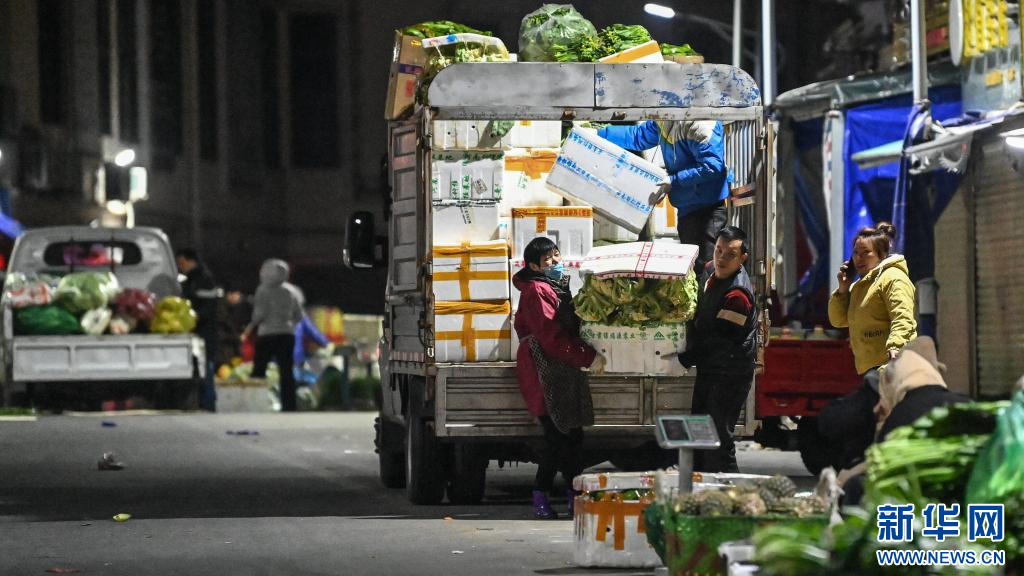 12月23日,在广西钦州市的蔬菜集散地东风市场,来自周边乡镇的蔬菜小商贩(右)在批发蔬菜准备供给早市。