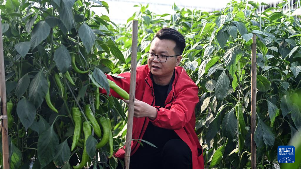 12月27日,在合浦县沙岗镇一家农业公司的智能大棚内,工作人员查看辣椒成熟度。