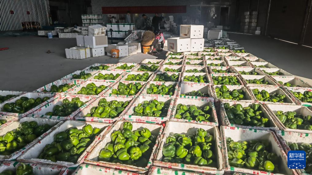12月27日,在合浦县沙岗镇一家农业公司的分拣仓,村民将分拣好的辣椒装箱。