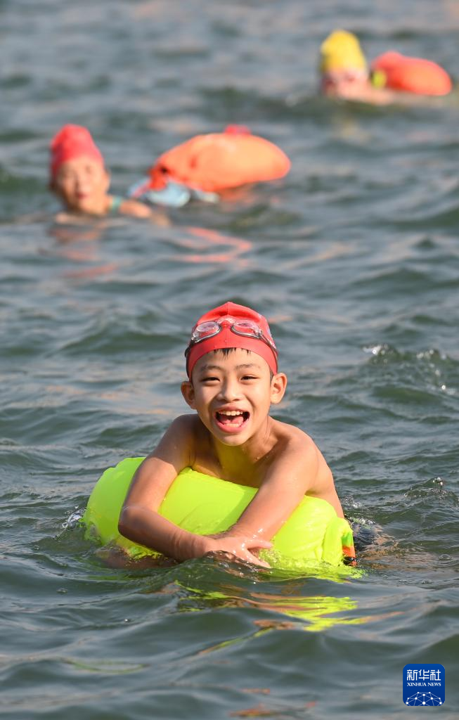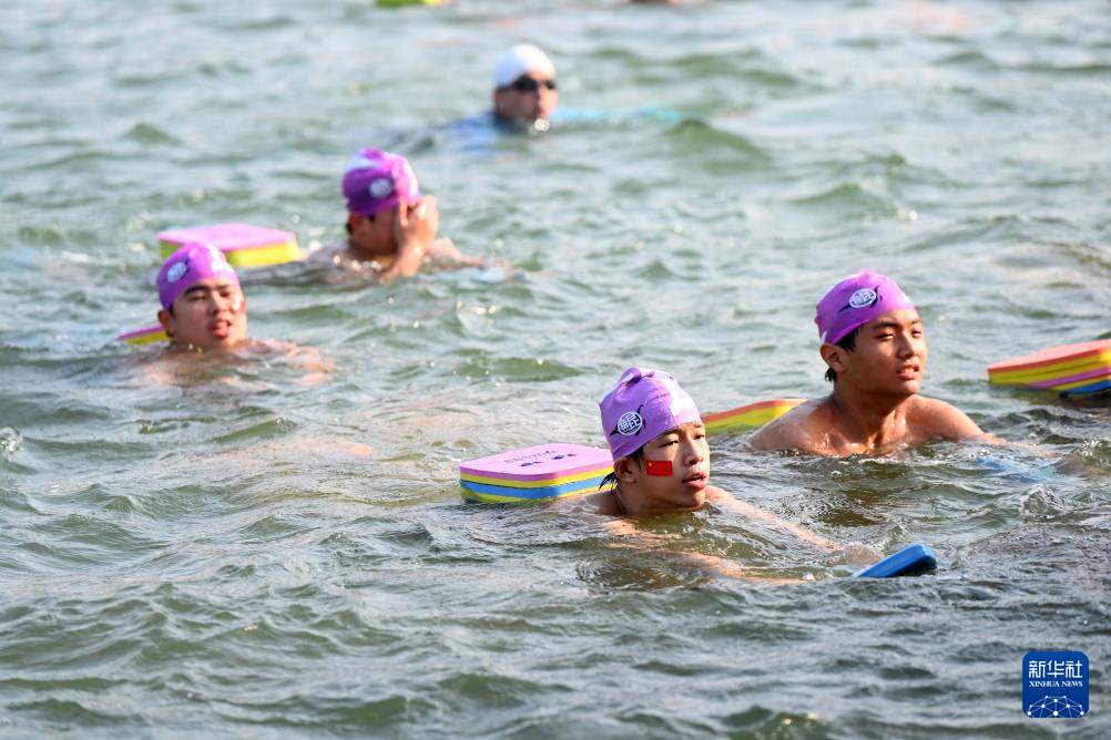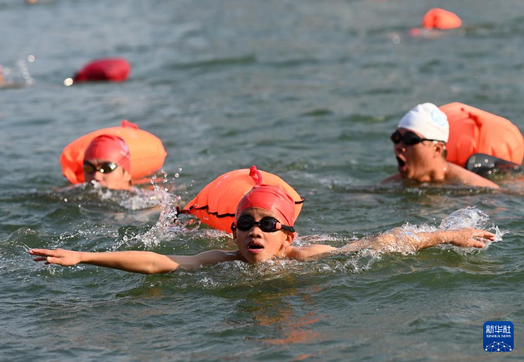 1月1日,游泳爱好者在广西南宁市邕江中参加冬泳活动。