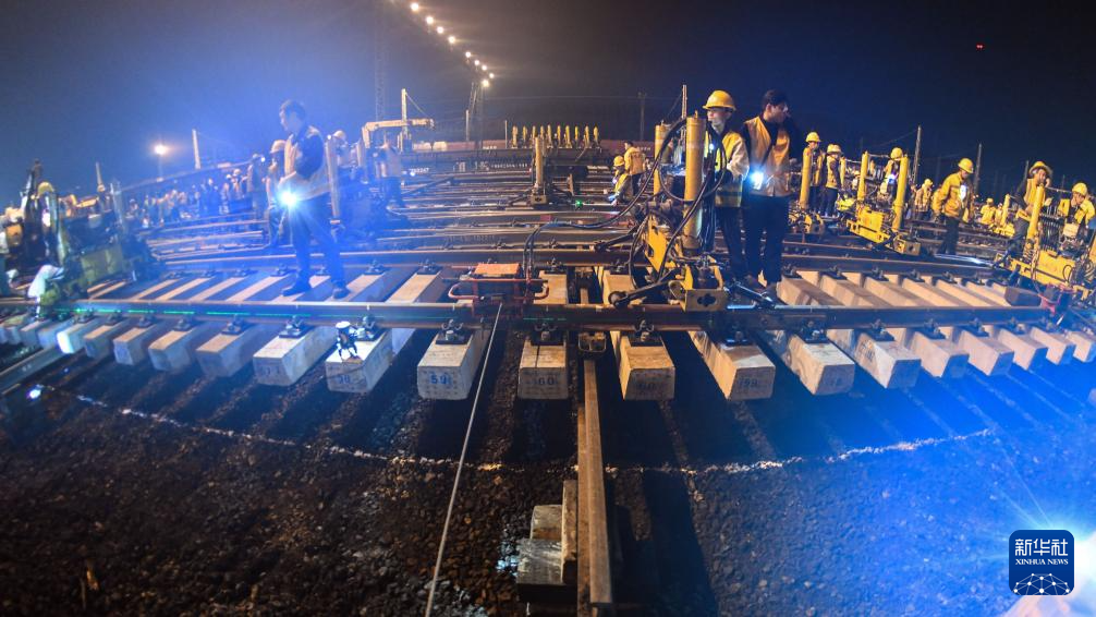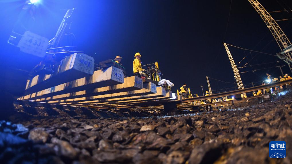 1月17日,在黎塘站,工人们在铺设新路轨。