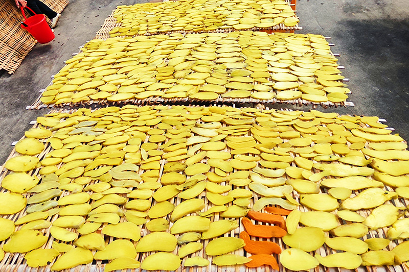 “目前狮峰村一共种植红薯800亩左右,一亩最少可以产1200斤红薯,60斤的红薯可以晒出15斤的红薯干,每亩大概有3500元的收入。”狮峰村总支部副书记曾敏玲说。
